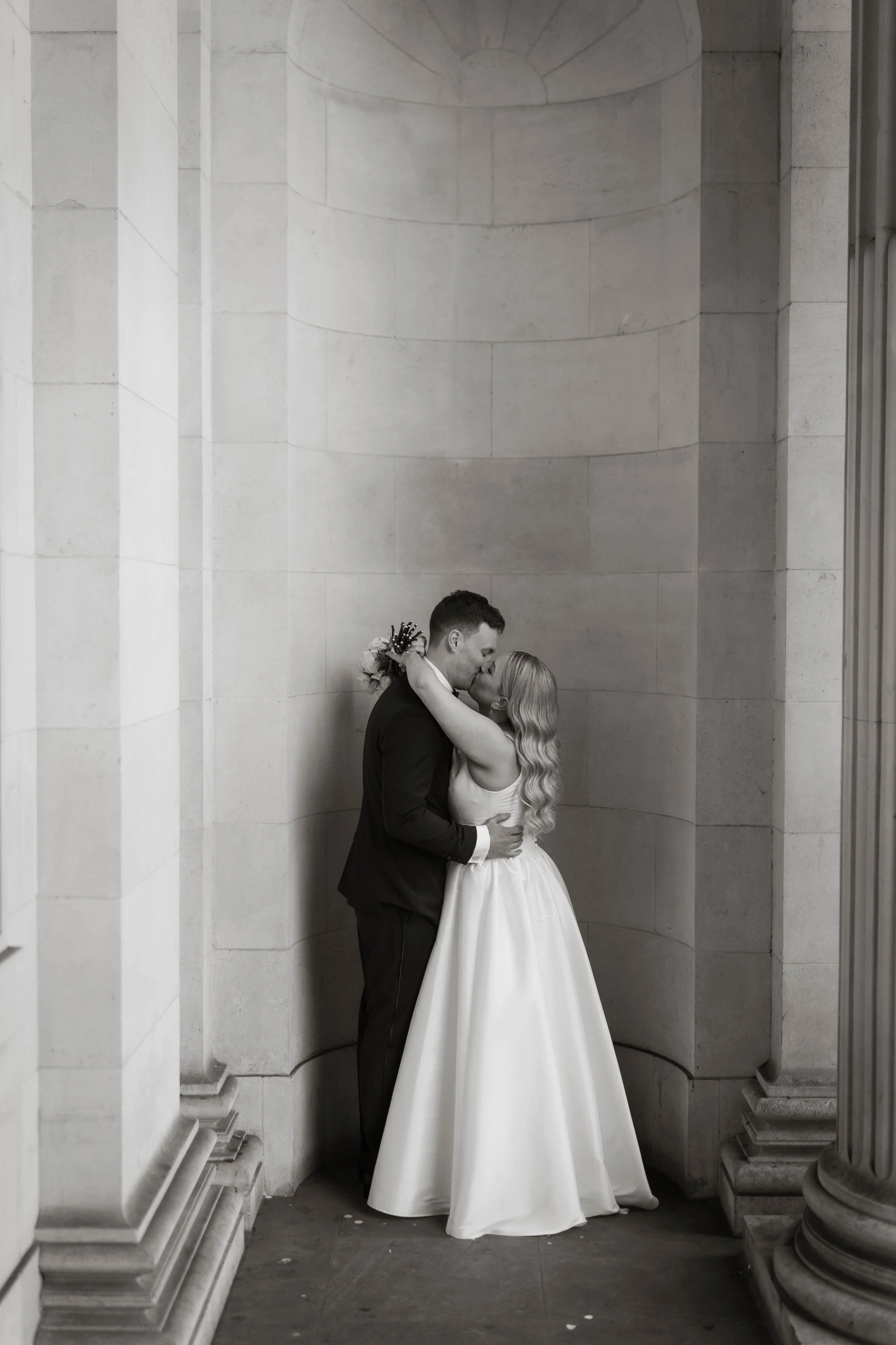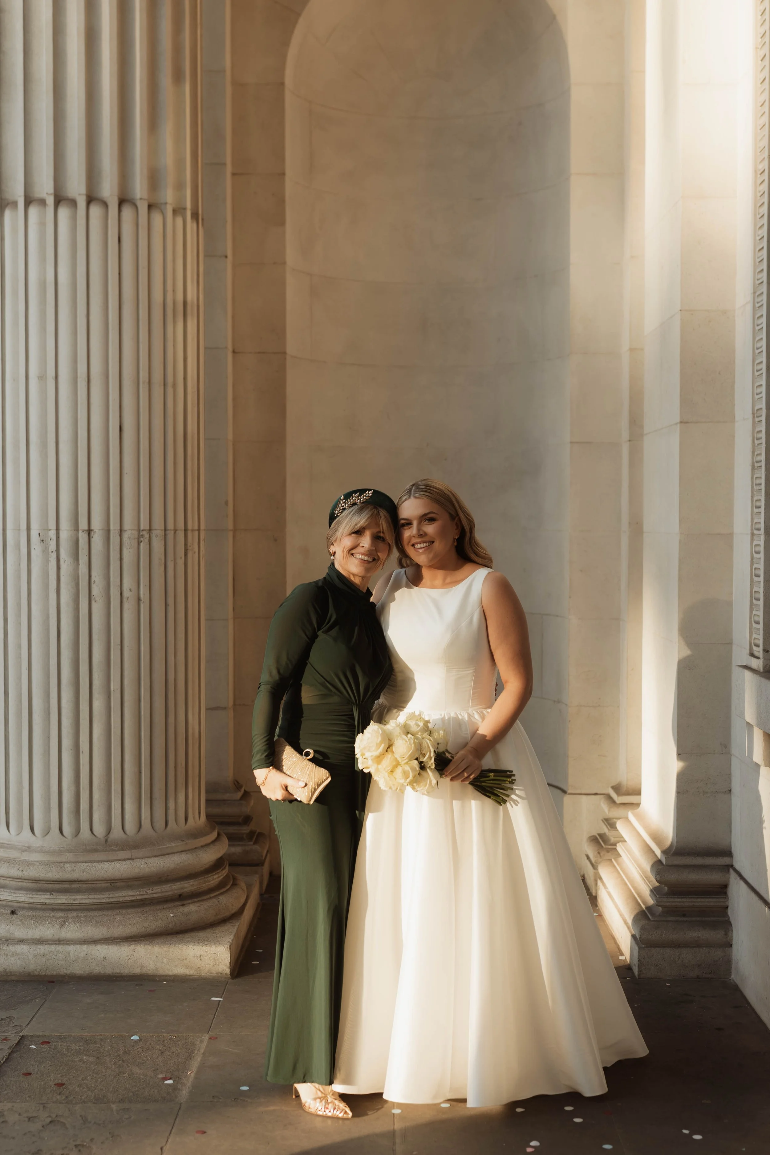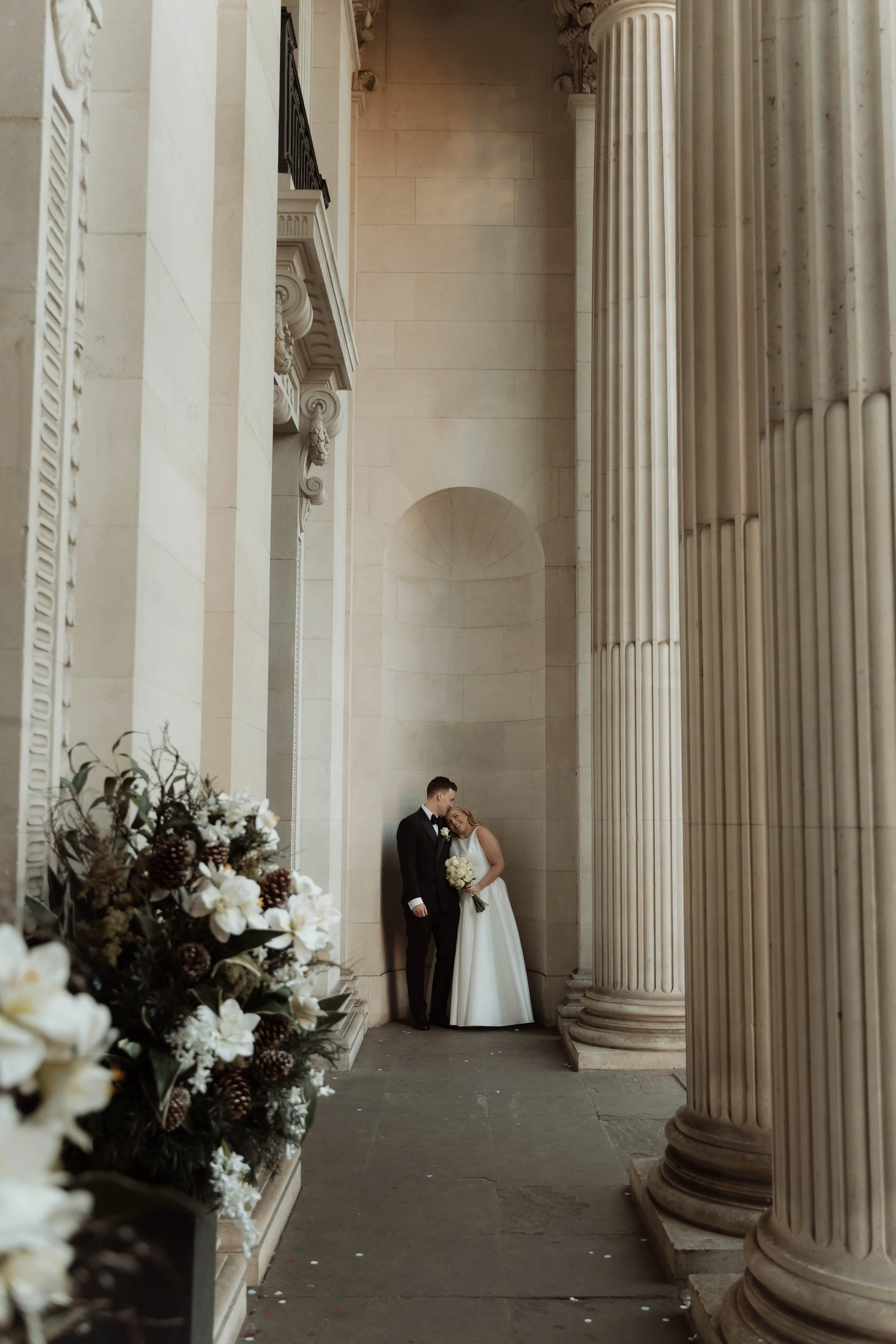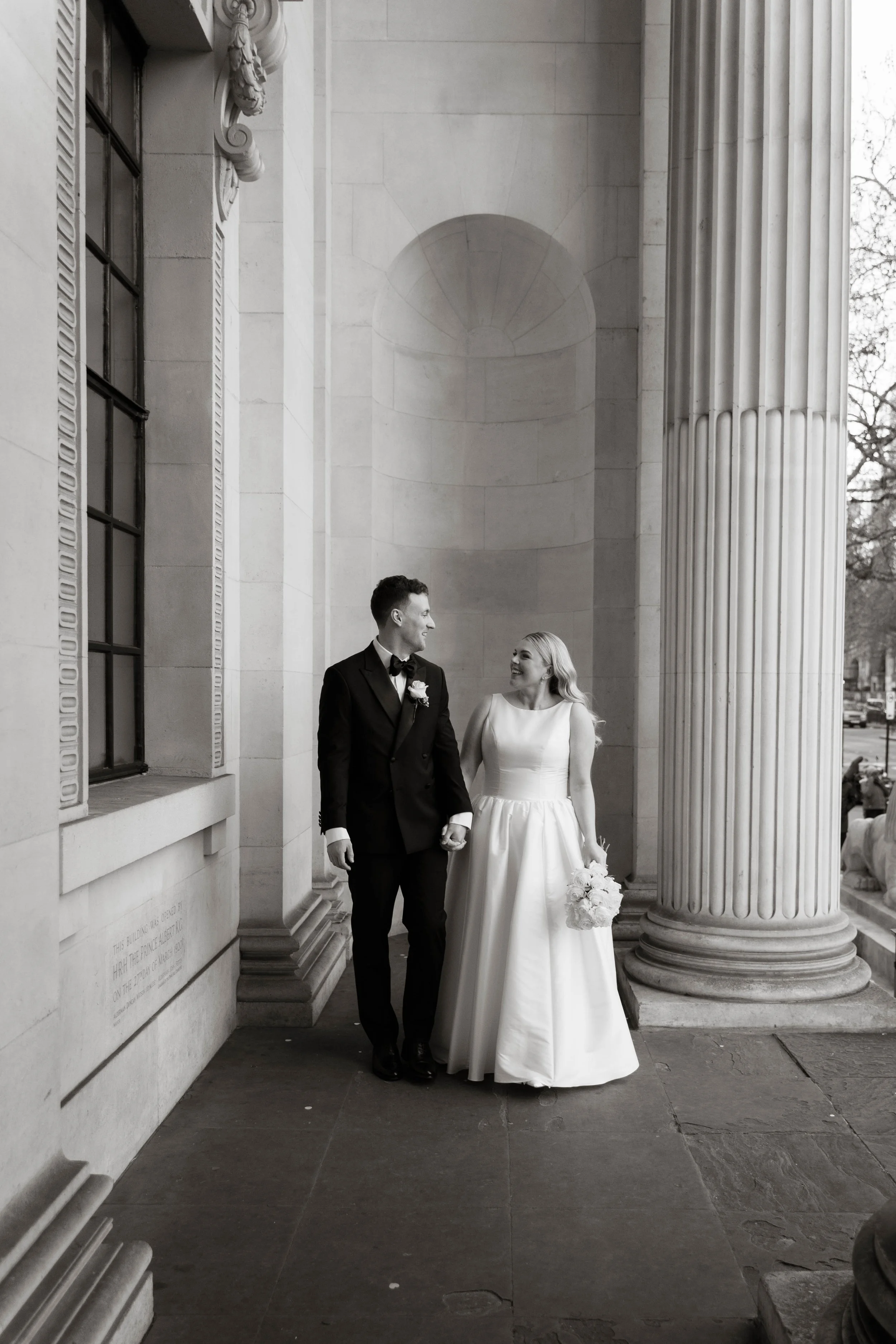 Old Marylebone Town Hall weddings can be very fast-paced, since it’s such a popular venue and they typically have back-to-back weddings. You’re usually given time to capture confetti centrally on the stairs and one group photo, then you are asked to move to the side for any additional photos. Ruby and Marc didn’t want to feel rushed on the day, so we prioritised just a handful of group photos so the remainder of our time could be spent on couple portraits to capture the iconic column shot