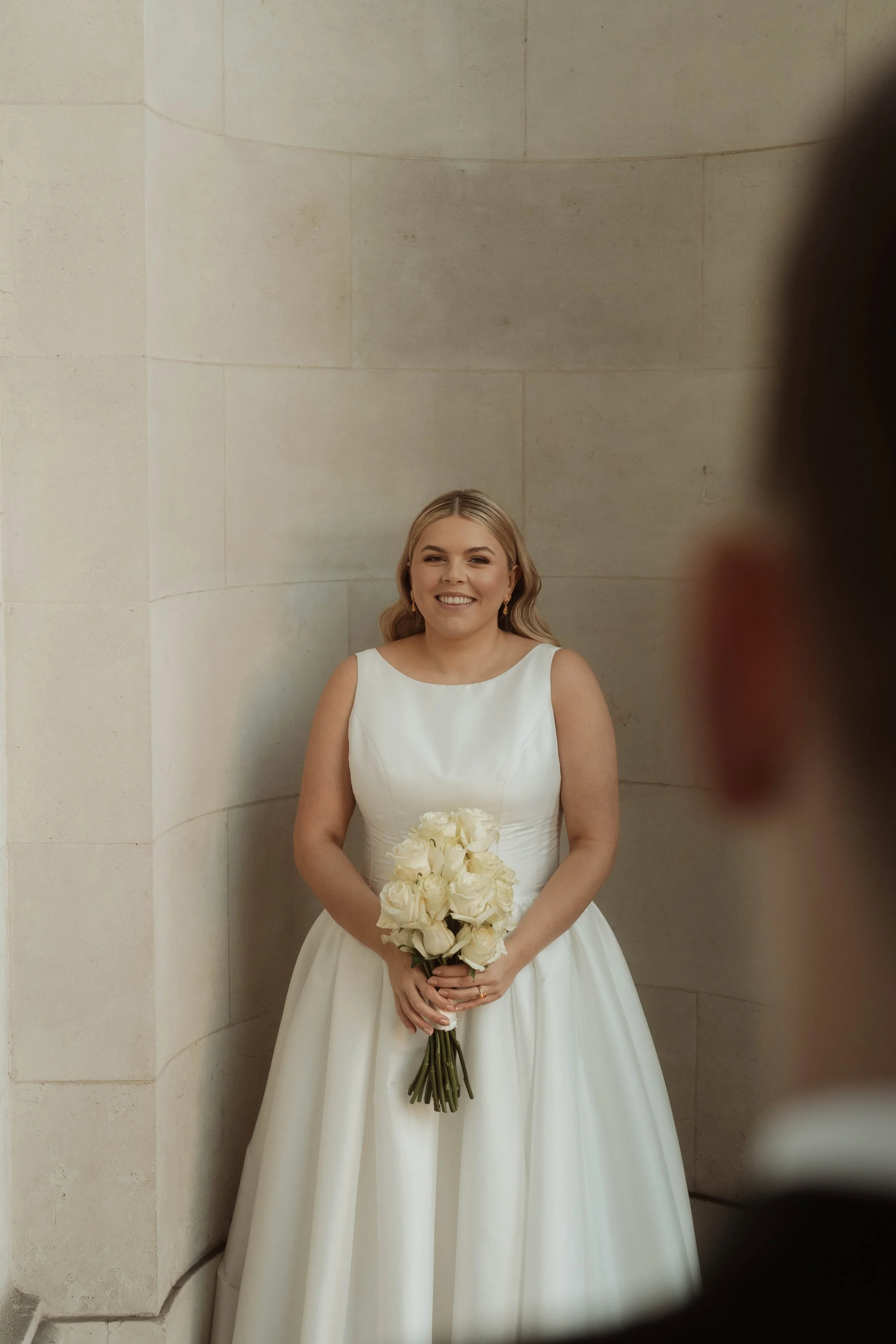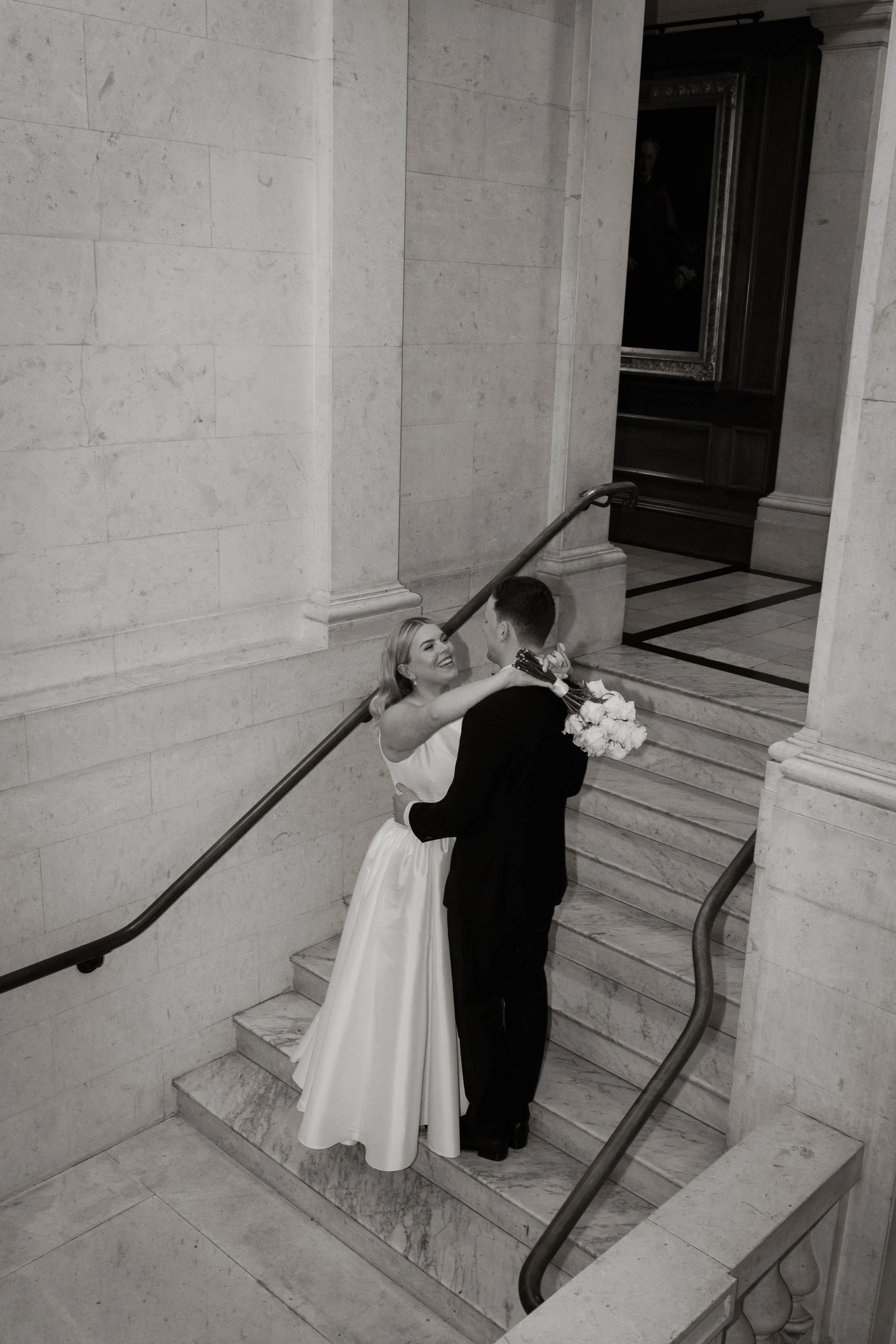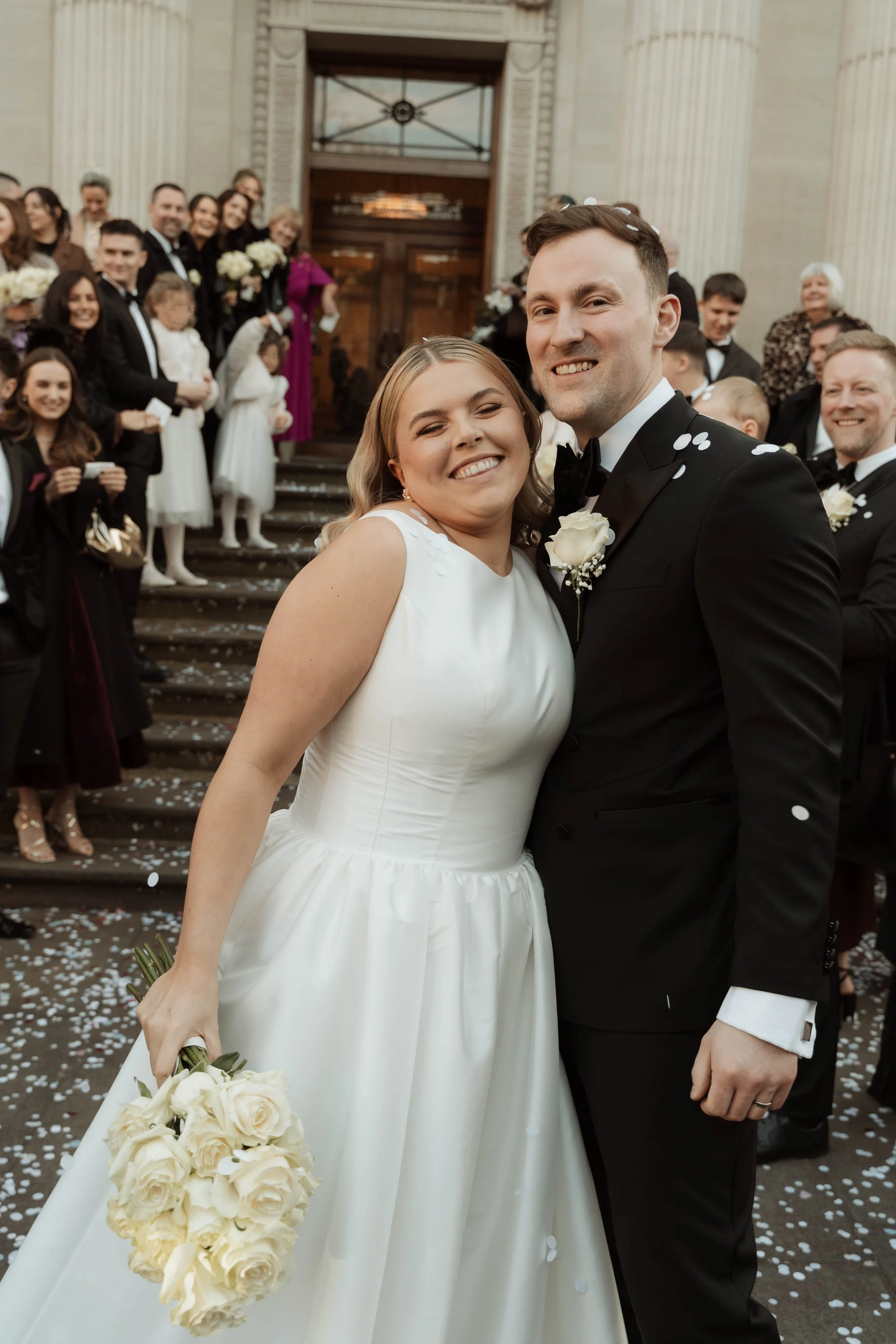 Old Marylebone Town Hall weddings can be very fast-paced, since it’s such a popular venue and they typically have back-to-back weddings. You’re usually given time to capture confetti centrally on the stairs and one group photo, then you are asked to move to the side for any additional photos. Ruby and Marc didn’t want to feel rushed on the day, so we prioritised just a handful of group photos so the remainder of our time could be spent on couple portraits to capture the iconic column shot